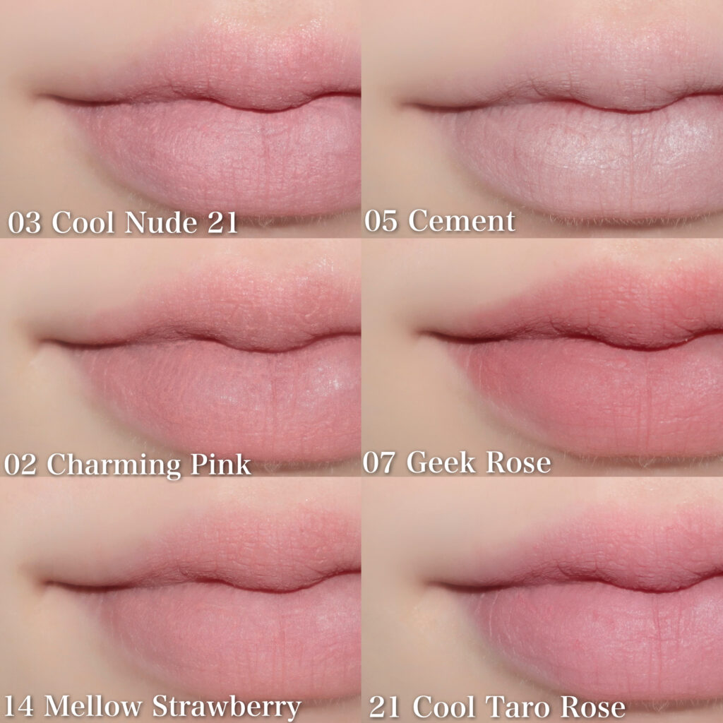 個人的に唇の赤みを抑えられるカバーティントの05セメントと、ブルベさんにぴったりな青みピンクのヌーディーブラーティントの21がお気に入り‎♡